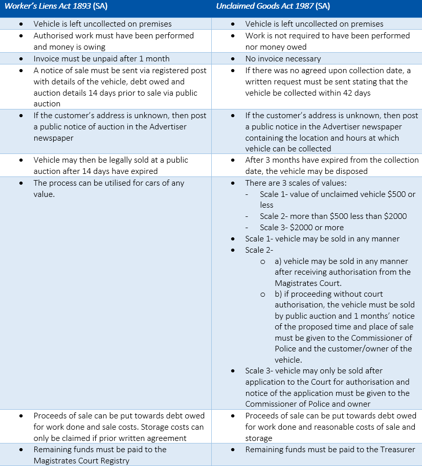 This table provides a comparison of the process to follow to dispose of an unclaimed vehicle under the Worker’s Liens Act 1893 (SA) and the Unclaimed Goods Act 1987 (SA):