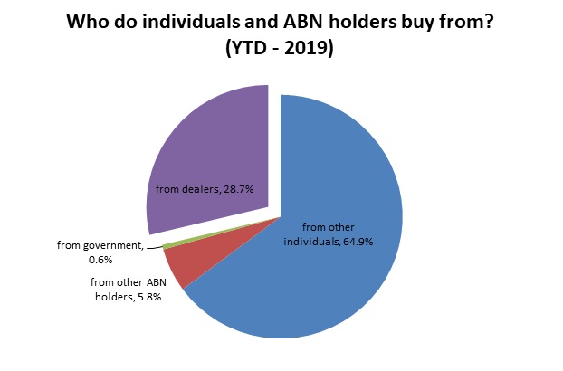 Dealer to Private registrations, at 102 units, was only 8% of the market (the 2018 average was 9.6%).
